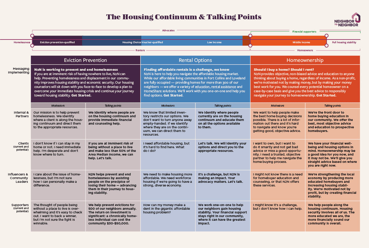 The rebranded Neighbor to Neighbor helped spark public support and increase awareness of their mission. As importantly, the process helped internal departments better understand each other and articulate their own voices within the larger N2N narrative.